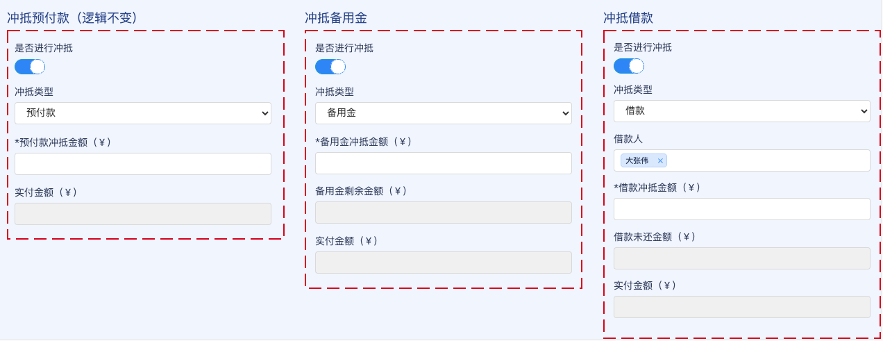 补充字段【借款冲抵金额、备用金冲抵金额】记录付款冲抵类型与金额