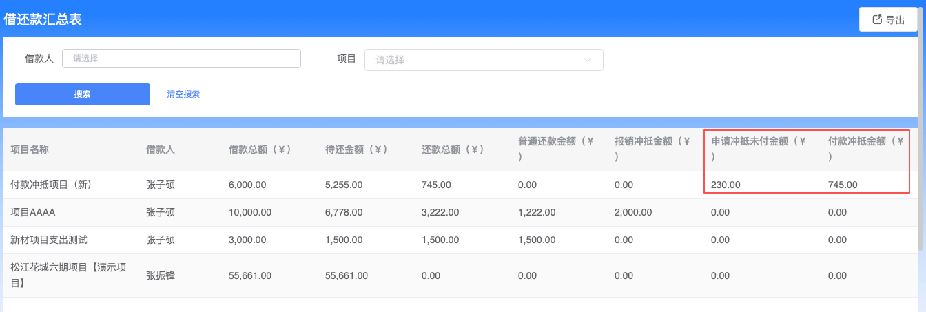 3、借款冲抵开启后(借款是以项目+人员为单位统计)